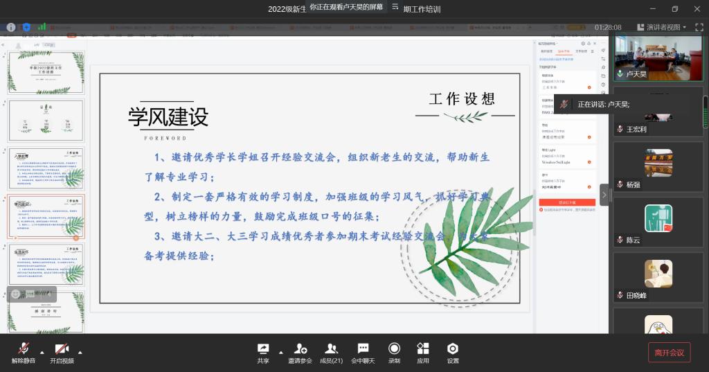 新聘任的2022级班主任依次进行工作设想展示,内容涉及学风建设、学涯规划、职业前景引领、创新创业教育、班级管理等,视角全面,方案周密,目标清晰。院长王宏祥结合班主任的工作设想进行点评和总结,他指出,班主任工作意义重大,是推动学院“三全育人”、助力学生成长成才的重要力量。在工作实践中,一方面,班主任一定要落实“融合发展观”,多交流多协作,形成立德树人合力;另一方面,班主任要明确工作定位,讲究工作方法,怀有无私奉献的心,严管厚爱,正确引导,身先垂范做好学生的榜样,以优秀教师培养优秀学生,努力成为学生学业导师和生活益友。