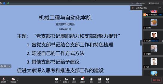 2024年1月25日,机械学院线上召开党支部书记工作例会,会议主题为“党支部书记履职能力和支部凝聚力的提升”,学院党委书记王宏利、各支部书记参加,教工第一党支部书记高奇主持会议。