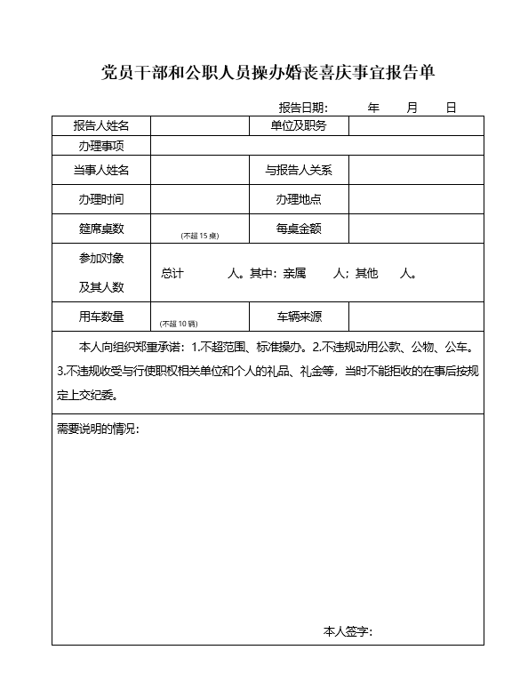 党员干部和公职人员操办婚丧喜庆事宜报告单