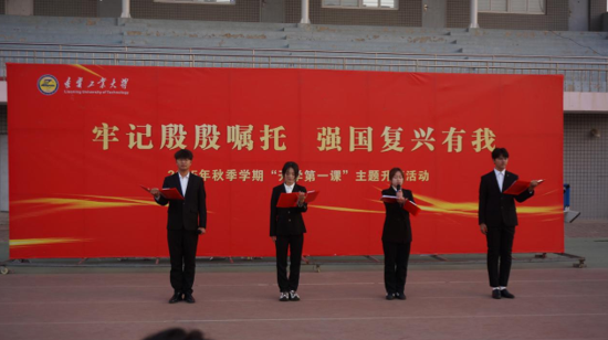 伴随着雄壮的《义勇军进行曲》,鲜艳的五星红旗冉冉升起,全体师生庄严肃立,高唱国歌。随后,机械学院周雅萱、代明、郭玉阳、李杭琦四名同学共同朗诵了《以青春之名,赴强国之约》,号召广大同学以赤子之心回应时代召唤,以青春之力奔赴强国之约。汽车学院侯星男、王星辰、胡谕婷、王婉宁同学演唱歌曲《我乘着风飞过来》,用激昂的歌声传递出对祖国的热爱和对未来的憧憬,展现了新时代青年积极向上的精神风貌。